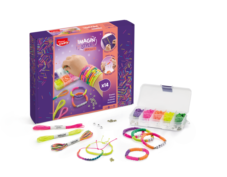| Μια συναρπαστική δραστηριότητα! Φτιάξτε 16 βραχιολάκια χρησιμοποιώντας δύο διαφορετικές τεχνικές χρησιμοποιώντας το κουτί. το οποίο μπορεί να χρησιμοποιηθεί αργότερα ως αποθηκευτικός χώρος για τις δημιουργίες σας. Η συσκευασία περιλαμβάνει κλωστές σε φωσφοριζέ χρώματα , λευκό ελαστικό νήμα (250cm), χάντρες Heishi σε φωσφοριζέ χρώματα :κίτρινο, πορτοκαλί, πράσινο, μωβ και ροζ , ασημένια μεταλλικά διαχωριστικά Heishi, ασημένενιες στρογγυλές χάντρες, χάντρες καρδιές και γράμματα, 1 διακοσμημένο κουτί με θήκες για αποθήκευση, 1 εγχειρίδιο. Κατάλληλο για ηλικίες 7+ . |