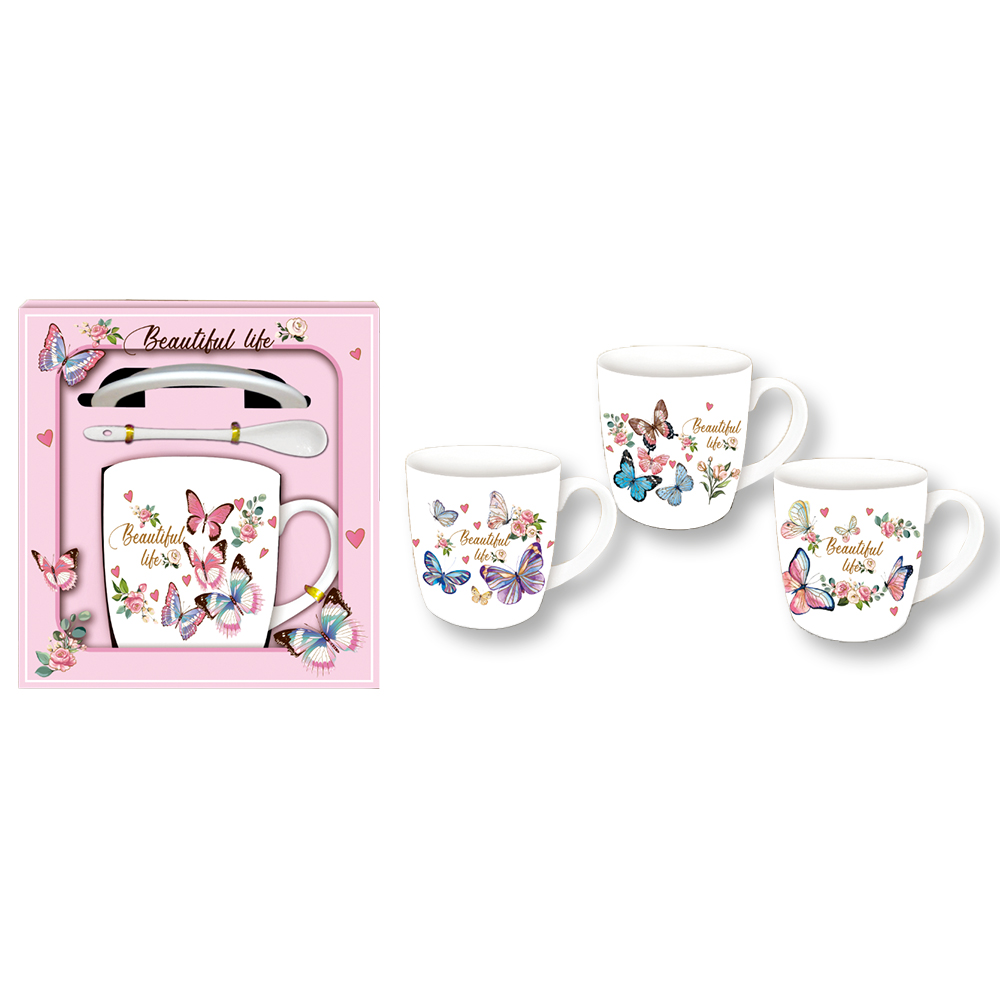 Κεραμικό σετ κούπας “Beautiful Life” με πιατάκι και κουταλάκι, τοποθετημένο σε έτοιμη συσκευασία δώρου, ιδανικό για καταστήματα ειδών δώρου, concept stores και εποχιακές προτάσεις. Το σετ περιλαμβάνει κούπα με butterfly και floral σχέδια, πιατάκι και κεραμικό κουταλάκι. Το προϊόν διατίθεται σε ροζ συσκευασία δώρου με πολυχρωμία στο σχέδιο της κούπας (ροζ, εκρού, μπλε, μωβ, πράσινο και πολύχρωμα floral στοιχεία). Η διάσταση της κούπας είναι 9x8.5cm, μέγεθος ιδανικό για καθημερινή χρήση καφέ, τσαγιού ή ροφημάτων. Η gift συσκευασία το καθιστά έτοιμο για πώληση χωρίς επιπλέον συσκευασία, προσφέροντας υψηλή εμπορική αξία για B2B πωλήσεις και εποχιακές συλλογές δώρου. Κατάλληλο για προτάσεις δώρου όλο τον χρόνο, αλλά και για περιόδους όπως Άνοιξη, Mother’s Day, Valentine και γενέθλια.